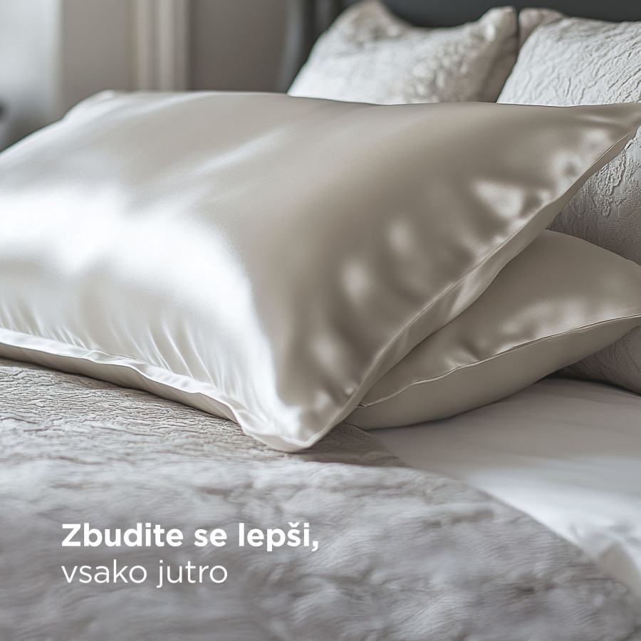 Lepotni spanec z anti-age učinkom – svilena prevleka za vzglavnik za gladko kožo brez gubic in sijoče lase brez vozlov. Izdelana iz 100 % naravne murvine svile najvišje kakovosti 6A (22 momme) za nežnost in mehkobo, ki ju občutite takoj. Zmanjšuje trenje, preprečuje lomljenje las in nastanek spalnih gubic. Ne vpija vlage iz kože in vaših nočnih krem, da lahko anti-age nega še bolj učinkovito deluje med spanjem. Hipoalergenska, naravno odporna na pršice in idealna za občutljivo kožo. Elegantna in lahkotna – popolna za vsakdanjo uporabo ali razkošno darilo.