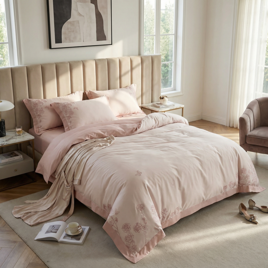 Prestižna vezena posteljnina iz 100 % bombaža egipčanske kakovosti. Sijoč in svilnat izgled satena. Izjemno kakovostna in mehka na otip. Hitro sušenje in enostavno vzdrževanje.